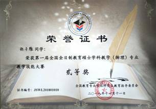 2018年11月10日在浙江师范大学举行的2018年第一届全国全日制教育硕士学科教学(物理)专业教学技能大赛(决赛)中,必一·运动(B-Sports)官方网站2016级全日制教育硕士学科教学(物理)专业学生张瑞琪获一等奖(指导教师杨英、罗海军),徐子雁获二等奖(指导教师杨英)的好成绩。