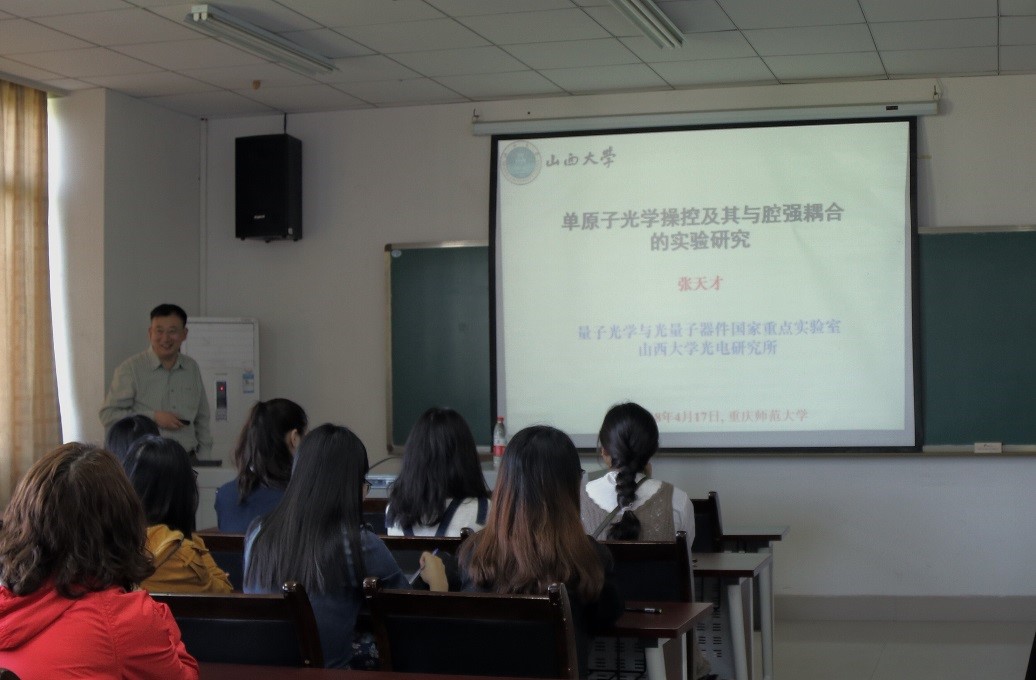 4月17日,山西大学副校长,中国物理学会量子光学专业委员会主任张天才教授应邀莅临必一·运动(B-Sports)官方网站,为广大师生带来了一场以“单原子光学操纵及其与腔强耦合的实验研究”为题的学术讲座。必一·运动(B-Sports)官方网站院长崔玉亭教授主持讲座。必一·运动(B-Sports)官方网站物理学等专业的师生到场聆听。