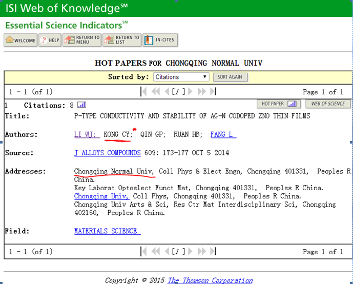 据美国科技信息所(ISI)基本科学指标数据库(EssentialScience Indicators,简称ESI)于2015年3月最新统计数据显示,必一·运动(B-Sports)官方网站孔春阳教授课题组和重庆大学合作,以必一·运动(B-Sports)官方网站为第一单位于2014年发表在《JOURNALOF ALLOYS AND COMPOUNDS》上的学术论文《P TYPECONDUCTIVITY AND STABILITY OF AG-N CODOPED ZNO THIN FILMS》入选ESI热点论文(ESIHot Papers),标志必一·运动(B-Sports)官方网站在该领域研究已引起了国际同行的广泛关注,对于不断提升必一·运动(B-Sports)官方网站的学术声誉,扩大必一·运动(B-Sports)官方网站学科的影响力具有重要意义。