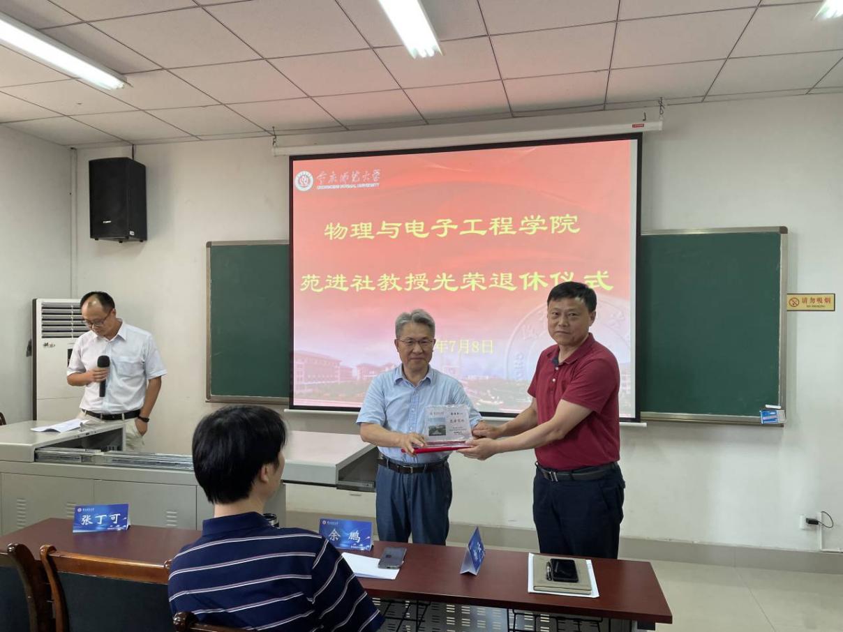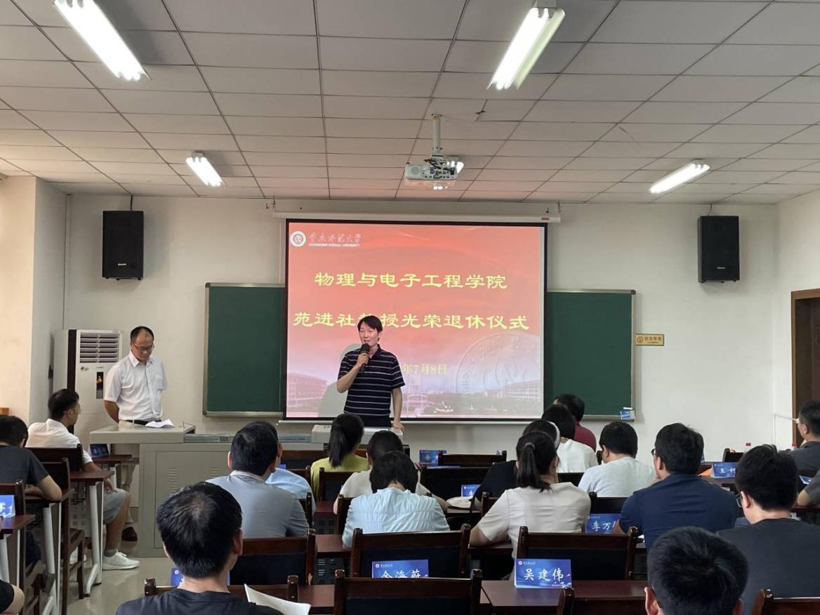 为传承物电学院尊师重教的优良传统,发扬老一辈爱岗敬业、刻苦钻研的精神,引导青年教师不忘初心、砥砺前行,7月8日下午,物电学院全体教职工在集贤楼531聚集一堂为苑进社教授举行了隆重而温馨的荣休仪式,仪式由工会主席范嗣强主持。