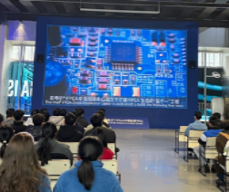 接着解说员带领同学参观了创新中心展厅。面对设计精良的芯片,丰富的实训项目展示成果,同学们聚精会神,对复杂的FPGA有了更进一步的了解。