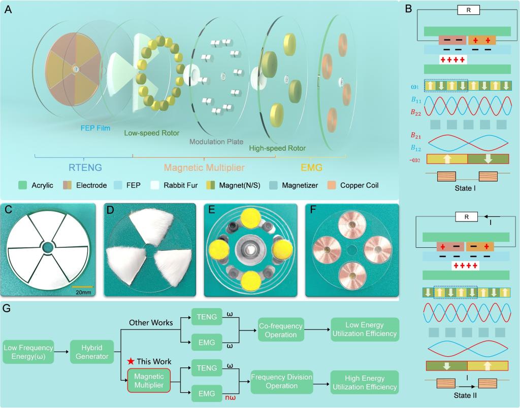 在各种能源中,机械能以其丰富度和可及性被广泛研究。机械能收集方法通常基于电磁、摩擦电和压电效应,其中电磁发电机(EMG)和摩擦纳米发电机(TENG)是两种最有效的方法。同时,与单一的EMG或TENG单元相比,引入摩擦电磁杂化发电机,可明显扩大工作频率范围。然而,大多数杂化发电机由工作在相同频率的EMG和TENG部件组合而成。但是两者的最佳工作频率失配,这使得驱动源必须具有一个较宽的频率范围,否则两者中只有其一工作在恰当的频率。因此,让杂化发电机的两个功能部件同时工作在最佳频率提升能量利用效率是至关重要的。基于磁速倍增器,本工作提出了一种普适性的分频策略,让TENG和EMG在同一驱动源频率下,各自工作在其适合的频率范围,实现杂化发电机的高能量利用效率。由传动比1:4的磁速倍增器构建的EMG的能量利用效率提高了48.2%。基于优越的供电特性,将其应用到水质监测和捕鱼警示等方面。