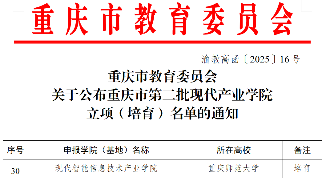 近日,重庆市教育委员会公布 2025 年现代产业学院建设名单,我校必一·运动(B-Sports)官方网站申报的 “现代智能信息技术产业学院” 成功获批市级立项(培育)。这是物电学院深入贯彻党的二十届三中全会精神,落实习近平总书记关于教育、科技、人才一体化发展重要论述的标志性成果,标志着学院在产教融合、学科交叉创新领域迈出关键一步。