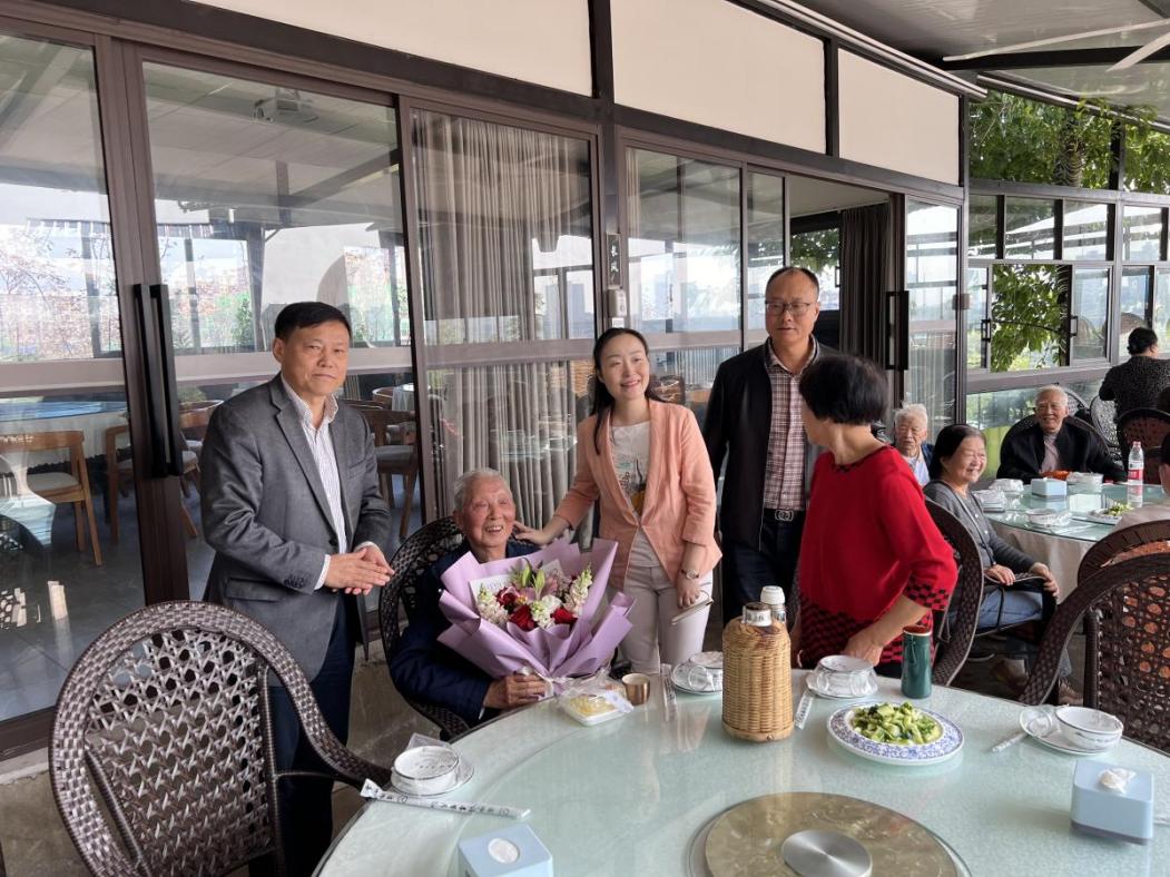 在物电学院领导班子的高度重视和学院工会精心策划下,本次秋游活动顺利开展。公园里风景如画,空气清新,满目的绿意让老师们心旷神怡。老教师们沿着步道赏花、拍照,叙旧、聊天,一路欢声笑语。当天恰逢王承先老师九十岁、姜继咏老师八十五岁生日,学院精心为两位老师准备了蛋糕和鲜花。学院党委书记杨云、党委副书记曾艳、工会主席范嗣强为两位老教师献上鲜花,并祝他们身体安康、生日快乐。秋日暖阳高照,每个人脸上都洋溢着幸福的微笑!