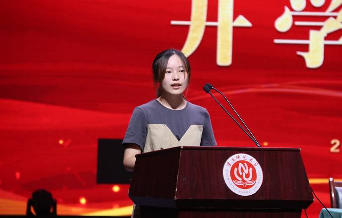 “书山有路勤为径,学海无涯苦作舟”,高年级学生代表罗昳以高年级学长学姐追逐梦想,苦心钻研的事例向新生分享了一个词语——坚持。她希望新生们能够坚持不懈,不忘初心继续在求学路上不断前行,迈向成功。