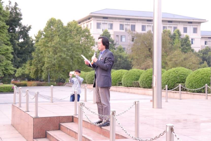 早晨7:45,活动准时开始。国旗护卫队迈着整齐铿锵的步伐向着旗台走去,同学们肃立等待。鲜艳的五星红旗伴着激昂的国歌冉冉升起,同学们深怀着对祖国崇高的敬意行注目礼。