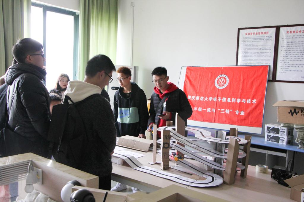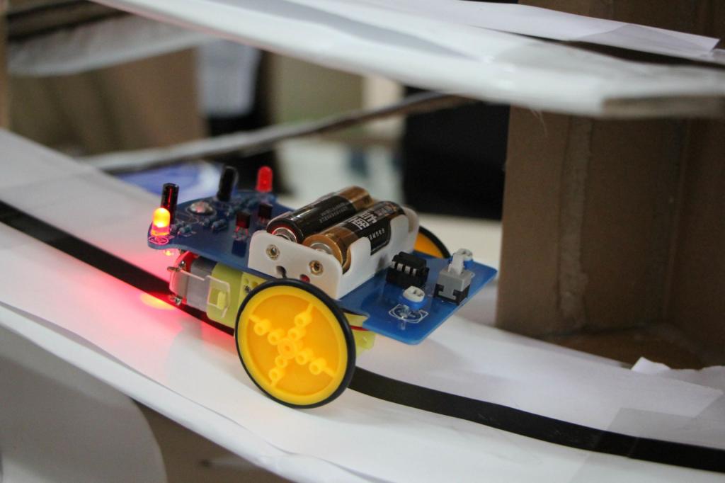 在最后的成品展示会上,主持人对比赛的注意事项和相关规则进行讲解。技术部人员检查赛道无问题后,参赛选手和裁判们就各自就位,裁判指导参赛队伍准备,在按下计时器的同时启动小车,并对小车到达终点的时间进行记录。小车在赛道上按照道路中间的黑线向前行驶,穿过上下坡、转弯、直角,顺利到达终点。