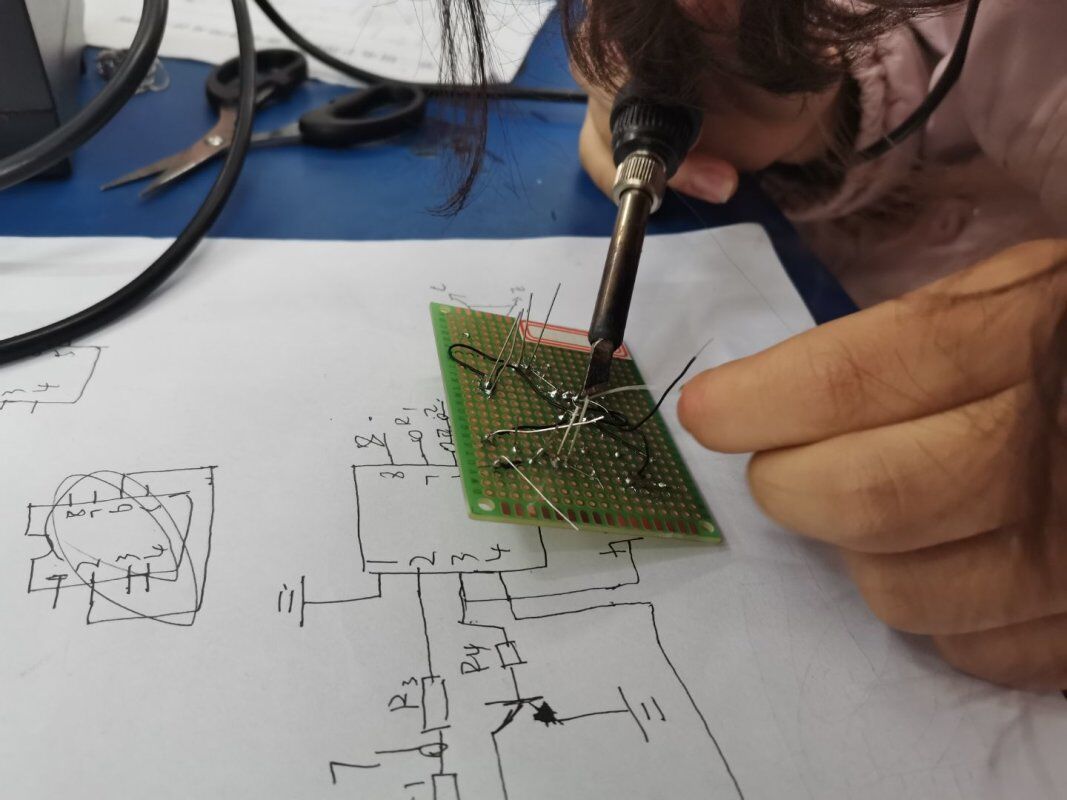 培训活动现场,主持人详细地说明大赛注意事项和焊接的理论知识,并由负责人向参赛者介绍循迹小车的循迹原理以及如何使用万用表来检测小车是否焊接正确。技术部人员讲解如何使用电烙铁并让参赛者们亲身操作使用,并再三叮嘱焊接过程中要注意安全,以避免安全事故的发生。