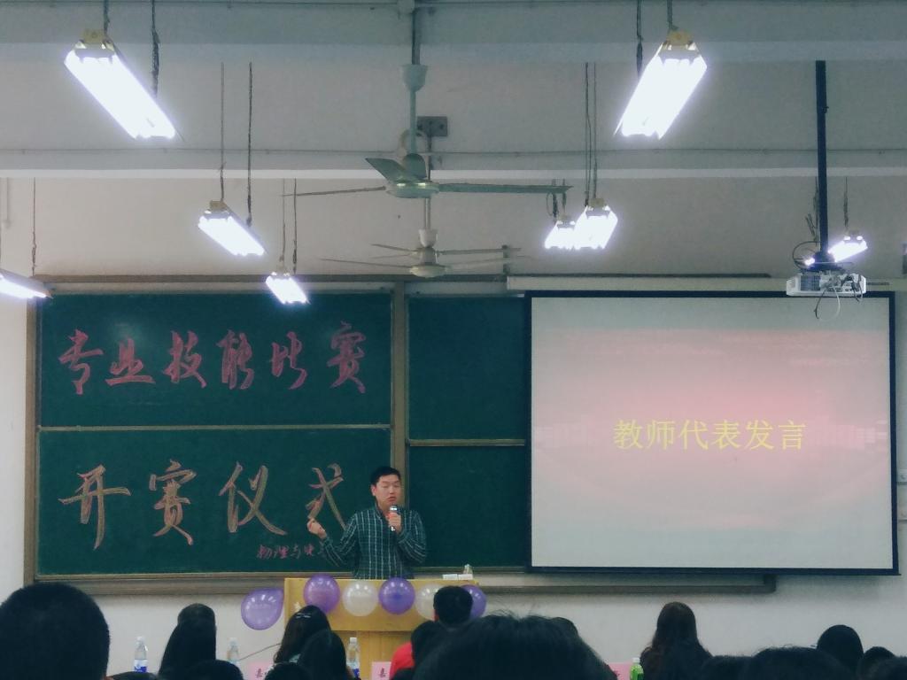 专业技能竞赛开赛仪式在同学们的强烈期待下如期而至,同学们的参赛热情顿时高涨。为了进一步强化学生专业技能训练,提高学生实践能力、创新能力,提高必一·运动(B-Sports)官方网站学生专业技能水平和动手实践能力,丰富比赛经验,为今后每位学子的就业打下良好基础,促使同学以最好的状态迎接大赛的到来,增强同学们的自信心,2017年11月3日下午一点,物理与电子工程院学生会科技部、学习部于弘德楼15104开展专业技能竞赛开赛仪式。邀请各专业老师为参赛同学现场指导,从而帮助同学们整理思路,积极备战。到场嘉宾有专业技能竞赛指导老师罗光老师、张丁可老师、范嗣强老师,团总支书记兼学工办主任李青松老师和全体辅导员,以及非师范生学生代表石林,师范生学生代表唐越。
