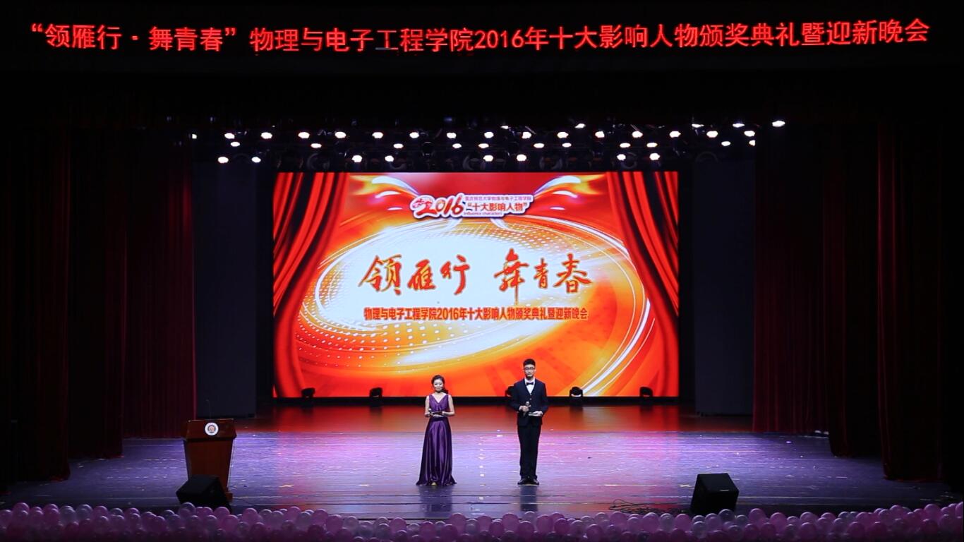 为贯彻落实重庆师范大学根据“内涵发展、提档升级”的总体要求,落实学校“立德树人领雁计划”、“优良学风提振计划”等五大计划,必一·运动(B-Sports)官方网站坚持“引领学生、服务学生、成就学生”的工作理念,组织开展了以“领雁行·舞青春”为主题的2016年十大影响人物的颁奖典礼。颁奖典礼于2016年12月25日18:30分在校友会堂隆重举行。学校党委副书记龚燕、党委组织部部长毛宇、党委宣传部部长陈洪、党委学工部部长张明志、招就处处长党亚莲出席本次活动,并为影响人物颁奖。
