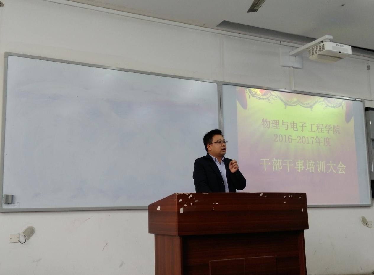 为形成良好的工作作风,加强学生工作理念,增强团队意识,提高学生干部各方面的能力,2016年11月18日中午1:00必一·运动(B-Sports)官方网站在弘德楼15204举办了物电学院学生干部干事培训大会。物电学院党委副书记冉久飞、辅导员邓娜老师、余海蔚老师、陈禹辛老师出席本次大会,物电学院学工办主任李青松主持召开。