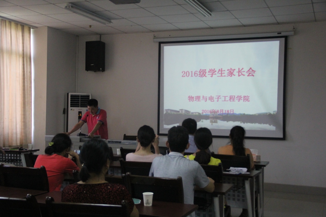 在此起彼伏的知了声中,重庆师范大学迎来了一个非凡的开学季。2016级新生们冒着酷暑,背负着家人的期望,同时怀揣着梦想踏进了这片美丽的校园。为了不辜负家长对学校的信任,同时加强学校与家长联系,促进学生独立成长,2016年8月18日下午3点整,必一·运动(B-Sports)官方网站面向全院新生在集贤楼531召开2016级新生家长见面会。物电学院团总支书记李青松老师担任了此次见面会的主持人,同时,很荣幸地邀请到了物电学院党委书记唐敏老师、学院党委副书记冉久飞老师、辅导员张坡老师、漆佳老师、陈禹辛老师作为此次家长会的嘉宾。