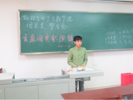 初夏时节,物电学院学生会团总支·学生会正值换届,为保障学生会工作继续有条不紊的进行,团总支主席团的竞选也正在进行当中。2016年5月26日,在集贤楼511教室成功举办了必一·运动(B-Sports)官方网站团总支·学生会主席团竞选演讲。团总支书记兼学工办主任李青松、辅导员邓娜、余海蔚、陈禹辛参加了此次竞职演讲。