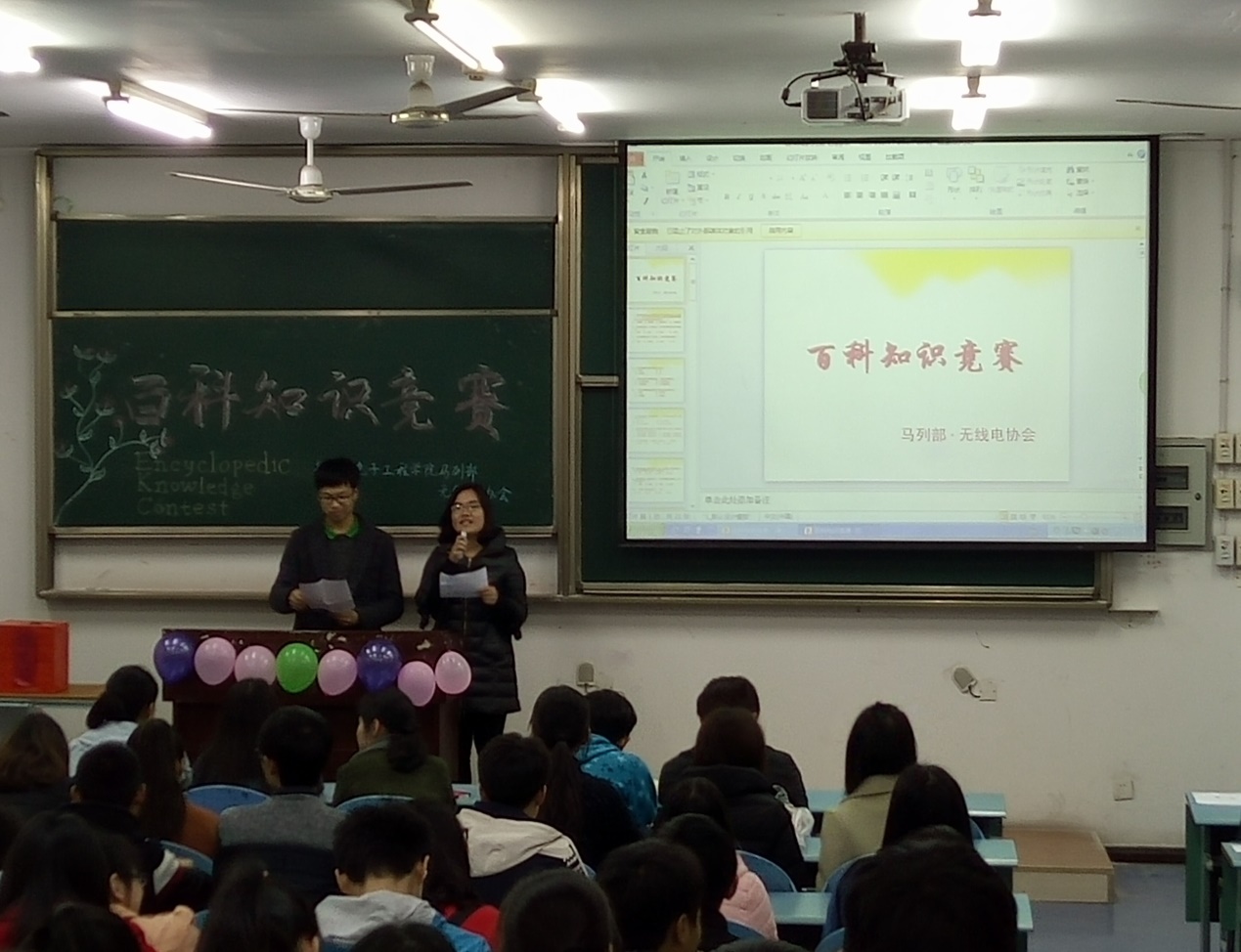 为了提高广大学生对百科知识的了解,弘扬中华民族积极进取的精神,展示大学生的丰富知识,了解更多领域的文化,营造良好的学校学习氛围,由物电学院学生会马列部主办,无线电协会协办的百科知识竞赛在弘德楼15201拉开帷幕。马列青马班与马列读书室成员携各自组员参加此次比赛。