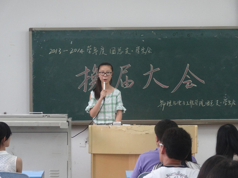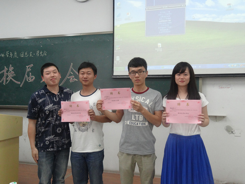 一段精心制作的换届视频拉开大会序幕,闪现而过的活动照片让大家回忆起一年来的点点滴滴。视频结束,上一届学生书记张婉君同学回首过去,对自己的工作进行总结报告;展望未来,预祝学生会新团体演绎出更加绚烂的篇章。随后,李青松老师上台发言。他在对大家过去一年的辛苦工作抱以肯定的同时给新一届团总支·学生会的全体成员下达新的工作任务——吸取经验,稳步向前,再创佳绩。接着,伴着欢乐的乐曲,到场的各位嘉宾为44名前任干部颁发聘书,并与其合影留念。李老师在热烈的掌声中宣布新一届团总支·学生会干部名单和上一届优秀干事名单。
