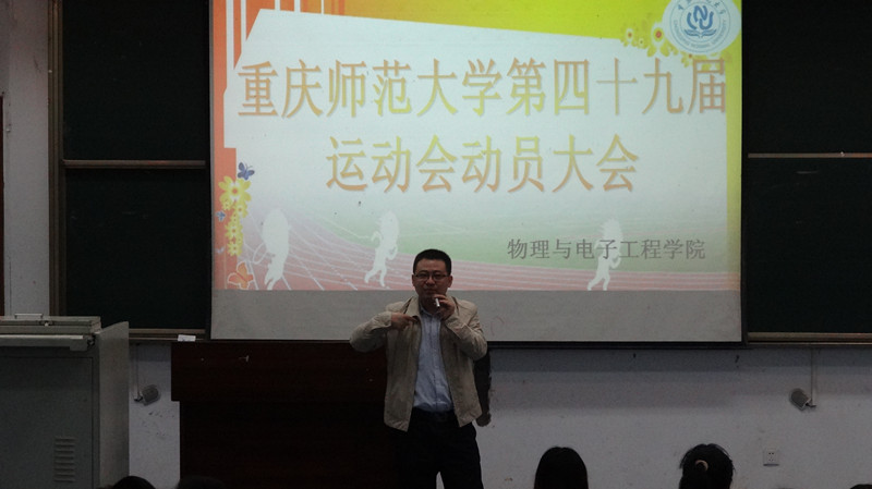 陈禹辛老师担任本次动员大会的主持人。大会刚开始,她就强调了参与运动会的重要性:个人突破自我的意志品质、集体团结合作的精神状态均会在运动中得到提升与改变。然后,冉久飞书记上台为大家致辞。冉书记虽然身体抱恙,但激情依旧,来到现场与同学们进行交流。他就自己作为实例向大家强调了以运动保证身体健康的重要性,在重师这个优秀的环境下,同学们应该珍惜每一次展示自我、突破自我的机会,追求更高层面的提高。对于一年一度的运动会,他鼓励大家通过点点滴滴的积累达到质的飞跃,以热血青年所具有的饱满精神努力拼搏、为院争光。
