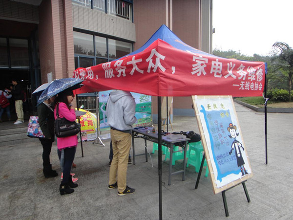 简陋的帐篷下人头攒动,附近学生公寓里的同学们将损坏的小台灯、小电扇、耳机拿到“大本营”内修理。一张桌子就是大家的工作台,一颗颗螺丝钉在维修员的手里跳着欢快的舞蹈。现场同学看到自己损坏的小物品又可以继续工作,不禁对“修理工”竖起了大拇指。同学们相互宣传协会的“便民”活动,不一会儿,活动点堆积了很多需要维修的物件,工作人员专注地拯救每一件坏掉的电器,为同学们送去冬日的温暖。