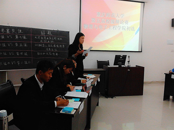 为活跃校园文化氛围,促进我校各学院之间的交流,提高我校大学生的语言表达能力和逻辑思维能力,2013年10月26日18:00,重庆师范大学第五届校级辩论赛之必一·运动(B-Sports)官方网站初赛在物电实验楼501会议室激烈开赛。政治学院辩论队队长、队员以及必一·运动(B-Sports)官方网站学生会主席等应邀出席本次辩论赛担任评委。