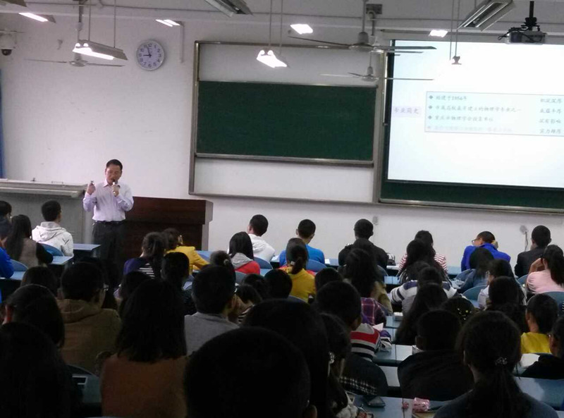物理学,由基本概念、基本规律和理论组成的体系,以严谨的、精密定量的实验为基础的科学学科。为了让2013级物理学(师范)专业新同学深入的了解物理学,走进物理学的世界,2013年9月29日,必一·运动(B-Sports)官方网站院长崔玉亭在弘德楼15204给他们举行了 “物理学专业思想教育“讲座,此次讲座由辅导员邓娜老师主持。