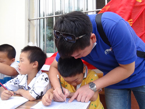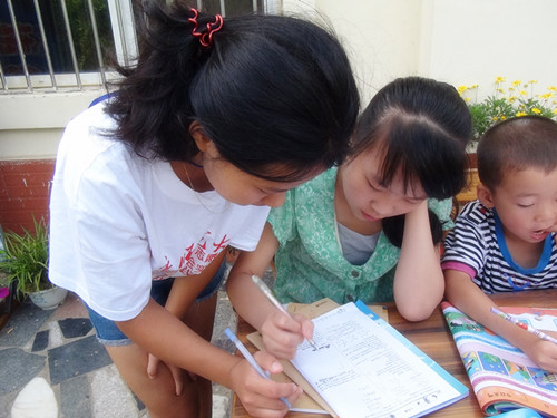 伴着欢声笑语,志愿者们相互合作帮忙将桌椅就位,小朋友们纷纷拿出了自己的暑假作业,认真地做了起来,那一张张纯真的面庞在朝阳的映衬下是那么动人…陆续地,可爱的小朋友们开始积极的举手向志愿者们寻求问题的答案,有问英语的,有问数学的,志愿者们耐心、仔细地讲解,小朋友们带着敬佩的眼光频频点头,志愿者们开心的微笑着,画面永远定格在那美好的瞬间。带队李青松老师也加入了志愿者的行列中,还手把手的教小朋友们在田字格写下“我的中国梦”这五个字,详细地为小朋友指出作业中的错误,小朋友们都亲切地称他为“老大”。