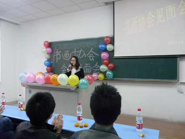 2012年11月1日下午16:30,重庆师范大学书画协会于弘德楼教室12306筹办了新一届的会员见面会活动,参与此次书画协会会员见面会的嘉宾有必一·运动(B-Sports)官方网站团总支·学生会主席张磊、前一任书画协会会长龙伟、社团联合会督导部副部长廖鹏以及团总支·学生会生活部部长陈青,此次见面会为大家提供了一个多彩的平台,让所有书画爱好的同学们相聚在一起,相互交流,相互学习。