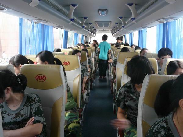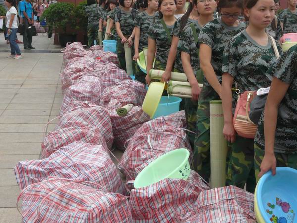 今日的迎新工作相对于前两天来说比较轻松,大部分2012级新生已经在7、8号报到完毕,只剩下大约数十个人尚未前来报到,所以今日的主要任务是让剩余未报到的新生走完迎新流程之后,将全部2012级新生送往璧山77146军训部队。一大早新生们就在忙活着准备出发去军训部队,在校园里到处都能见到身着绿军装的同学,他/她们朝气蓬勃,斗志昂扬。10点左右校正大门就已经挤满了人,按学院为单位排列在正大门后面的空地上,等待校车的接送。
