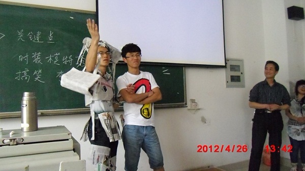 活动在一个别开生面的“模特时装秀”中展开了,大家按照周老师的要求,用手中的报纸作布料,胶带作针线来为模特设计时装,作品的风格为搞笑、夸张,意在让同学们大胆创新,新颖脱俗。同学们的参与热情很高,不一会儿各种“惊艳”的时装就设计完成了。接下来的时装展示更是体现出了同学们的思维创新能力,掌声、尖叫声不断,活动达到了小高潮。周老师对同学们的表现给予了高度的评价与肯定。