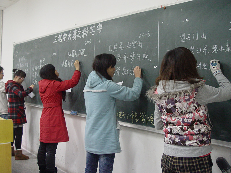 2011年12月1日14:30,必一·运动(B-Sports)官方网站三笔字大赛在沙坪坝和大学城两个校区同时进行,大赛掀起了一场书万丈豪气,品传统精髓的轩然大波。此次大赛,来自两个赛区三个年级的同学积极的参与进来,参与人数超过280人次。本次比赛有幸邀请到2009级辅导员邓娜老师,2011级班主任蒋小平老师,团总支·学生会书记李佩,及马列部部长汪阳等学生会主要干部前来指导工作,同时邀请到原团总支宣传部部长罗晓,原办公室主任贾立平,原文艺部部长段美清,还有多次获得校书法比赛一等奖的赵树灵及在三笔字大赛中多次获得荣誉的李全朝、赵伯倩等同学来担任粉笔字现场评委。