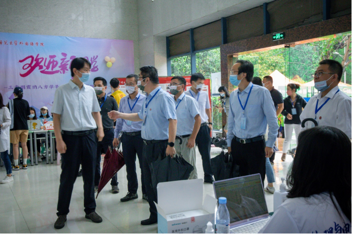 9月3日下午,重庆师范大学校长孟东方、物电学院党委书记杨云、副院长余鹏(主持工作)、党委副书记曾艳到迎新点看望2022级新生和迎新志愿者,他们仔细了解了2022级新生基本情况,为现场志愿者们送上关切,并叮嘱要严格遵守疫情防控相关规定,做好防护措施。