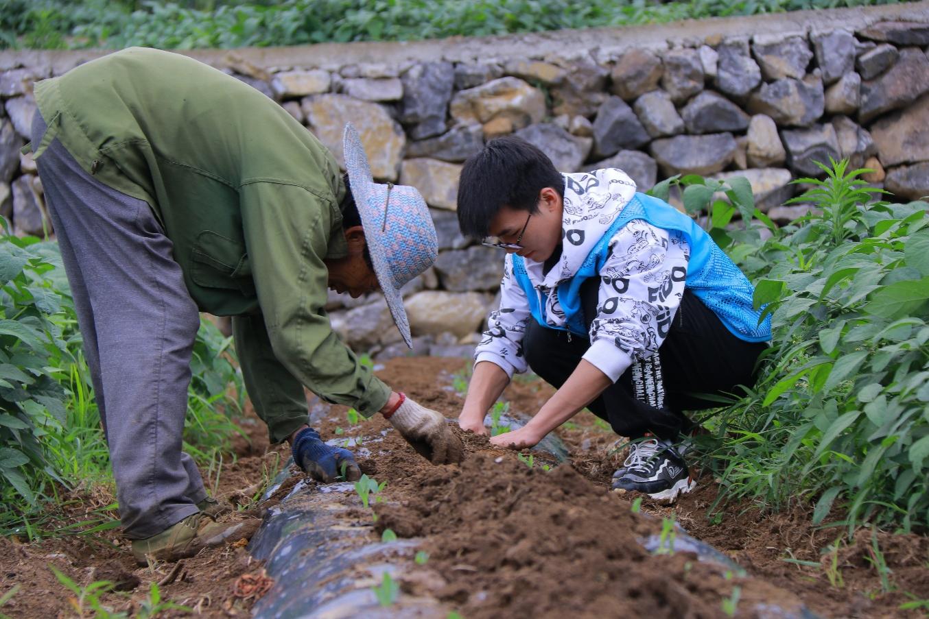 下午,实践队员再次前往“糯玉米”产业种植基地,实地学习种植技术。到达基地后,他们见到了“糯玉米”种植负责人带领村民工人正在种植玉米。据上午了解到,该队伍正是由负责人牵头造就的一支懂农业、爱农村、爱农民的“三农”工作队伍,实践队员们也快速加入播种队伍中。刚下的毛毛细雨,润得土地刚刚好。实践队员们,自发与不同的种植工人学习相关播种技术。有的队员在搬玉米苗、有的将玉米苗放进打好的土坑里、有的帮叔叔阿姨们挖地、还有的在埋土种植玉米苗。搬玉米苗的同学,一次性需要搬很大一箩筐的玉米苗,来回跨越几块土地数次。埋苗的同学也是一个坑一个坑的埋苗,种植工人告诉他们,每一个苗埋种的深度是有要求的,土壤也要厚厚盖过保温膜,防止温度流失,保证玉米苗正常生长。实践队员扎根土地,实地劳作两小时多后,才返回。