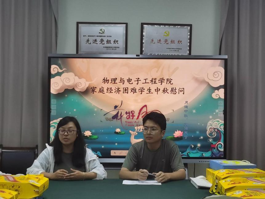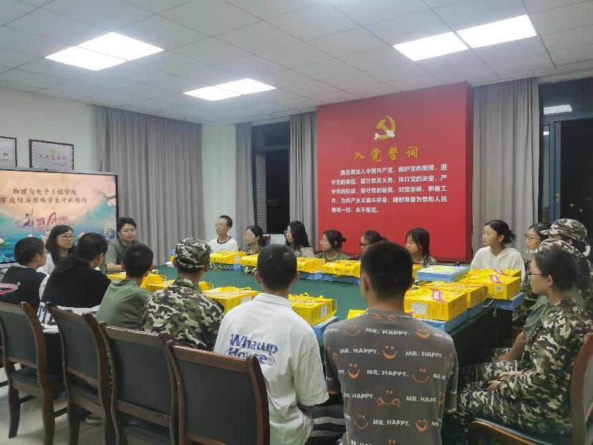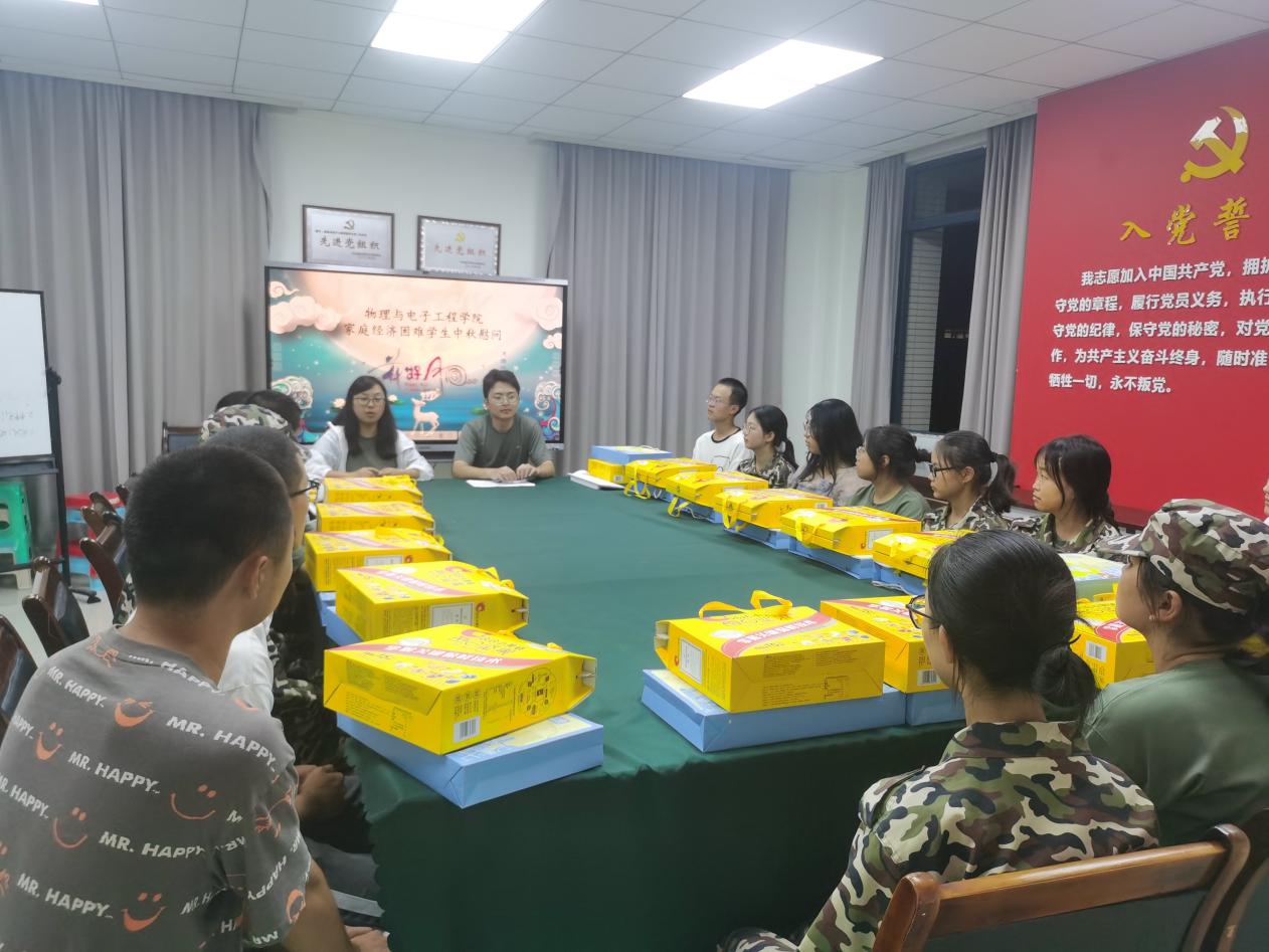悠悠秋风起,又见中秋到。为传递节日的温暖与祝福,让新生中家庭经济困难学生在佳节中感受到学校和学院的关心,2023年9月26日,物理与电子工程学院在集贤楼518举办了新生家庭经济困难学生中秋慰问活动。学院分团委书记余海蔚、辅导员马梓茂及2023级困难学生参加了此次活动。