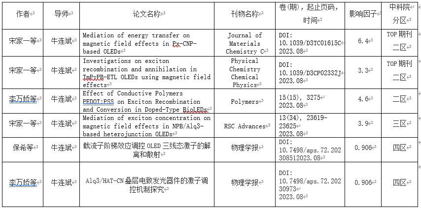 近日,必一·运动(B-Sports)官方网站有机半导体器件课题组科研取得很好的进展,课题组研究生在牛连斌教授等老师指导下,以重庆师范大学为唯一单位,在工程技术类TOP期刊《Journal of Materials Chemistry C》、在物理类TOP期刊《Physical Chemistry Chemical Physics》等发表6篇最新研究成果,获得2项国家发明专利授权。