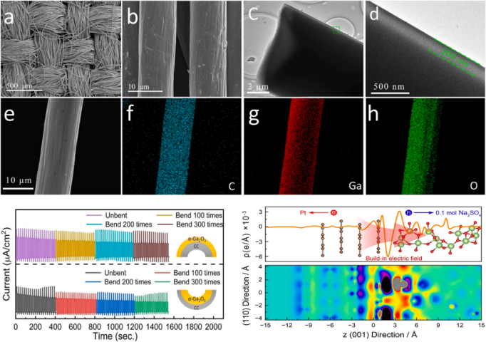 电子信息与工程(3+4)专业本科生张丹以《Flexible self-powered solar-blind UV photodetectors based on amorphous Ga2O3 modified carbon fiber cloth》为题在《Journal of Alloys and Compounds》期刊上发表论文,李泓霖副教授和李万俊教授为共同通讯作者。本工作利用磁控溅射技术在碳纤维布上制备非晶氧化镓材料(a-Ga2O3/CC),构筑了光电化学型自供电日盲紫外探测器。结果表明,a-Ga2O3/CC光电探测器具有高响应率(16.98 mA/W)和快速响应(0.16/0.1 s)。基于实验和第一性原理计算揭示了a-Ga2O3与CC界面处形成的内置电场,可以有效地分离光生电子和空穴,同时抑制载流子的复合。最后,对a-Ga2O3/CC光电探测器件进行了疲劳测试(300次弯曲处理),发现器件仍能保持出色的光电特性,具有较好的稳定性。本工作为研制高性能氧化镓基柔性光电化学型自供电日盲紫外探测器提供一种参考。