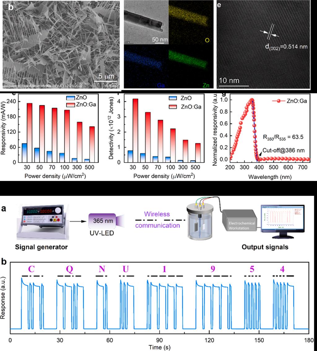 物理学(师范)专业本科生唐七鑫以《Enhanced photoresponse of self-powered ZnO-based photoelectrochemical-type UV photodetectors via Ga-doping for optical communication application》为题在《Journal of Alloys and Compounds》期刊上发表论文,张红博士、叶利娟副教授和李万俊教授为共同通讯作者。本工作针对当前光电化学型紫外光电探测器中ZnO材料面临的光生载流子分离效率低和导电性差的核心问题,提出了Ga掺杂优化策略,实现了高性能、低成本、低能耗的紫外光电探测器,优于已报道的同类器件的结果,并从微观层面解释了其探测性能提高的内在物理机制。同时,搭建了紫外光通讯系统,验证了该探测器在通信领域的应用潜力,为未来传感、通信和成像系统中的多功能光电器件的开发提供了重要基础。