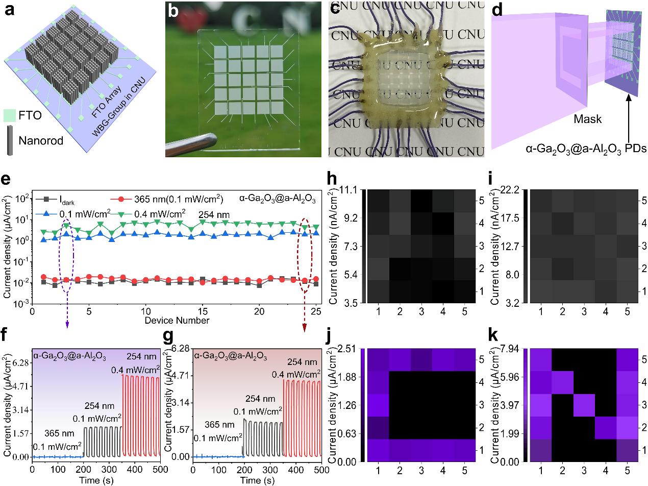 随着Ga2O3基日盲深紫外(DUV)光电探测器(PDs)的发展,将其集成到阵列图像传感器中成为一个热点研究课题。当前,日盲深紫外成像研究主要围绕固态PDs展开,新型光电化学型光电探测器(PEC-PDs)用于日盲成像应用方面仍存在显著的空白。为此,本工作构筑了高性能的α-Ga2O3@a-Al2O3核壳纳米棒阵列(NRAs) PEC-PDs。在DUV辐照和无外加偏压条件下,α-Ga2O3@a-Al2O3器件性能明显优于α-Ga2O3器件。当光强为0.50 mW cm−2时,光电流密度从4.60 μA cm−2显著增加到11.24 μA cm−2,响应率从9.60 mA W−1显著增加到22.70 mA W−1。此外,首次使用5×5矩阵的α-Ga2O3@a-Al2O3核壳NRAs基PEC-PDs来演示自供电日盲成像的概念验证,能够有效地捕捉字母“C”和“N”的形状。