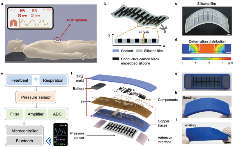 为解决当前柔性传感器件与信号采集监测系统的空间分离性,电子信息与智能系统课题组提出一种生理信号监测贴片设计,以实现个体生理信号的可穿戴无线监测。该研究工作基于生物兼容性良好的软弹性材料,制备了梳齿结构状柔性压力传感器,以平行于受力方向的接触-分离单元为传感面,改善传感器在大压力下灵敏度急剧下降的特性;结合柔性电路板(FPC)硬件采集、蓝牙传输及终端显示模块,该贴片能实现微弱心跳及强烈呼吸信号的同时监测,具备捕捉BCG信号(心冲击信号)的能力。该研究结果对呼吸疾病治疗的深入研究具有重要意义。