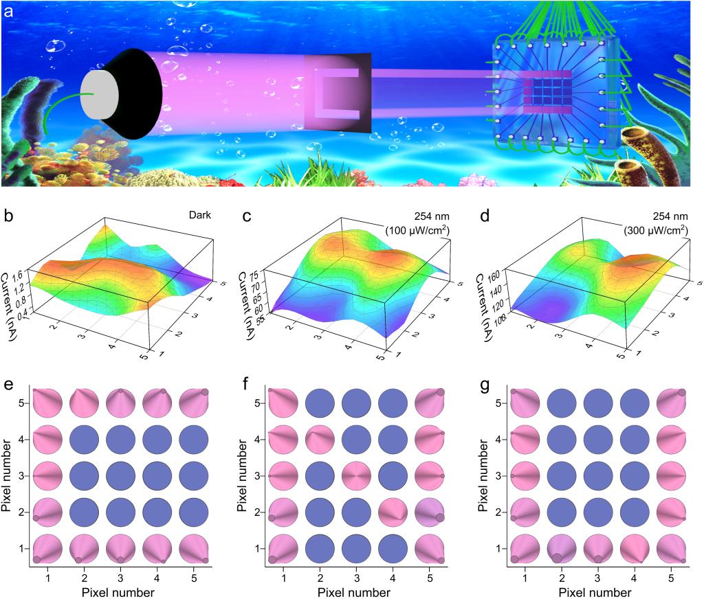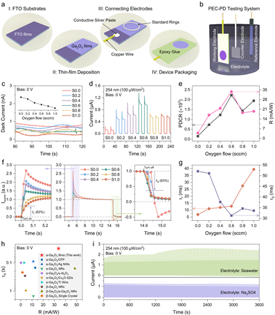 | 图为:非晶体Ga2O3薄膜基自供电PEC-PD性能 | 图为:非晶态Ga2O3日盲光电探测器在水下成像的概念验证演示   |