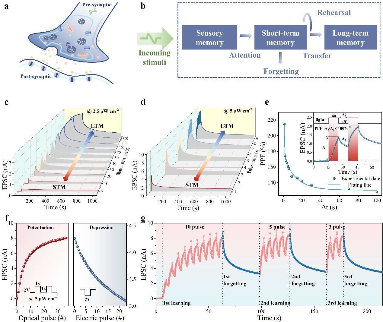 光电突触器件集成了光感知与信息处理的功能,以其优异的信号传输速度、高带宽、低串扰和低功耗等优点,成为了实现视觉神经形态计算技术的新兴功能器件。然而瞬态光触发响应特性通常导致不稳定的存储器保持时间和受限的电流响应范围,对神经网络系统的开发和实际应用构成重大挑战。
