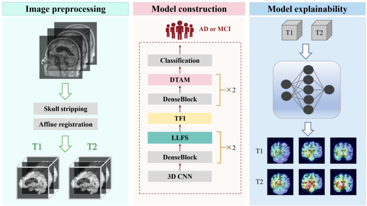 在第二篇论文《Attention-guided 3D CNN With Lesion Feature Selection for Early Alzheimer's Disease Prediction Using Longitudinal sMRI》中,姚立忠副教授介绍了一种新颖的轻量级三维卷积神经网络,专门用于捕捉脑疾病的演变,以预测轻度认知障碍(MCI)向阿尔茨海默病(AD)的进展。该模型采用纵向病变特征选择策略,从时间数据中提取核心特征,并引入疾病趋势注意机制,使模型更加专注于病变特征。同时,采用疾病预测可视化技术,提高了最终预测的可解释性。实验结果表明,该模型在曲线下面积(AUC)、准确率、特异性、精确率和F1分数等方面均达到了优秀的性能,仅需利用两个随访的结构性磁共振成像(sMRI)扫描就能准确预测MCI患者24个月后的疾病状态。