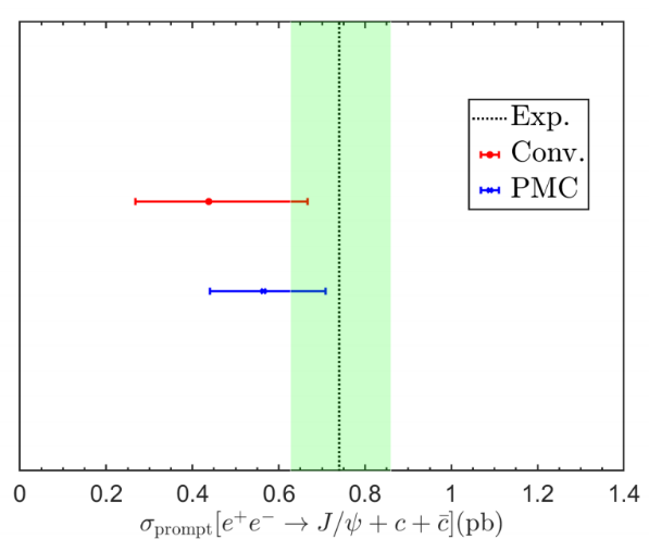 图为:PMC能标设定方法和传统能标设定方法下次领头阶总截面与Belle实验组测量结果的对比