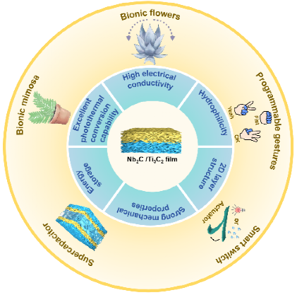 软体机器人凭借其灵活性和适应性,在灾后救援和生物医学等领域,展现出了广泛的实际应用发展潜力,但在开发多功能集成软体机器人方面仍面临诸多挑战。MXenes材料因其表面良好的亲水性、优越的导电性、导热性和强机械性能,在储能和软驱动器领域展现了广阔的应用前景。通过顺序真空过滤方法制备了柔性Nb2CTx/Ti3C2Tx薄膜。由于Nb2CTx/和Ti3C2Tx表面具有相似的官能团,使其层间具有更好的相容性,两层之间不对称的水吸附和解吸行为,实现了驱动器的多响应性。Nb2CTx/Ti3C2Tx薄膜光热驱动器和湿度驱动器均展示了出色的可逆变形能力和良好的稳定性,并且作为超级电容器的电极材料显示了优异的电化学性能。作为概念验证演示,利用Nb2CTx/Ti3C2Tx薄膜制备了仿生装置,模拟手势和智能开关,实现了储能系统和驱动系统的有效集成,证明了MXenes材料在智能材料领域的广泛前景,为多功能集成软体机械人材料的开发提供了新思路。