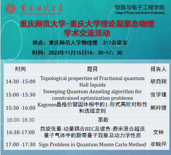 为加强理论物理创新研究团队建设,推进理论物理学科发展,11月15日下午,重庆师范大学理论物理团队与重庆大学强关联物理团队在重庆师范大学物电楼217会议室联合举办“重庆师范大学-重庆大学理论凝聚态物理学术交流活动”,探讨量子霍尔效应、强关联物理数值计算方法和冷原子物理等领域的发展动态和前沿热点问题,并分享交流各团队取得的最新研究成果。此次学术交流活动由必一·运动(B-Sports)官方网站理论物理团队主办,副院长(主持工作)余鹏教授主持,学院相关课题组的师生参加了此次学术交流活动。