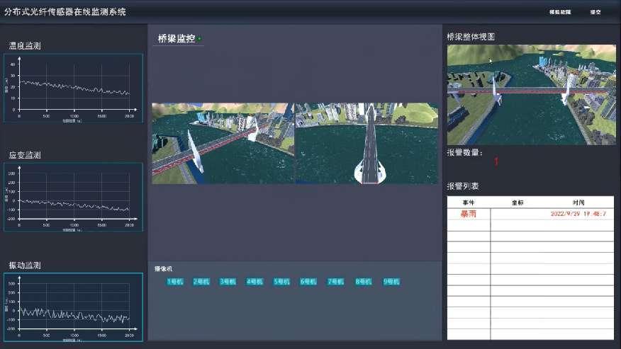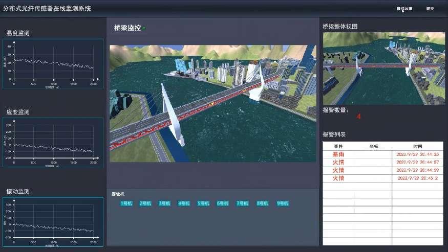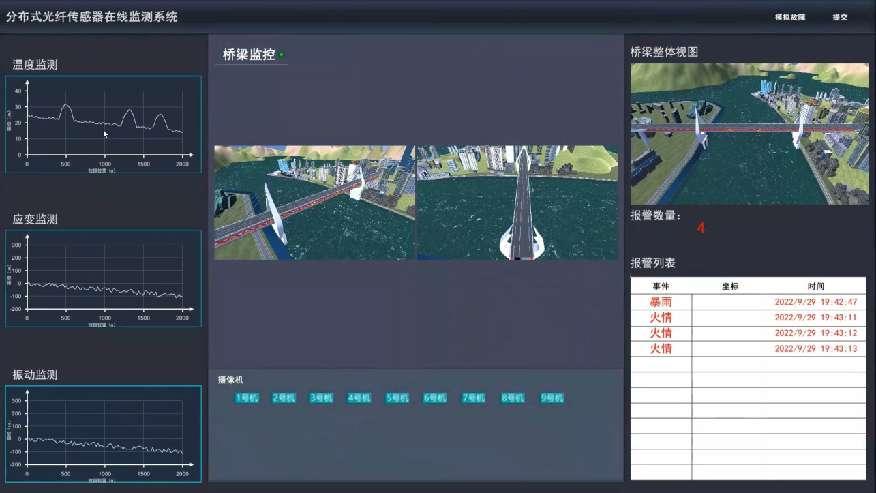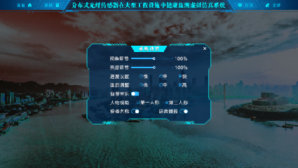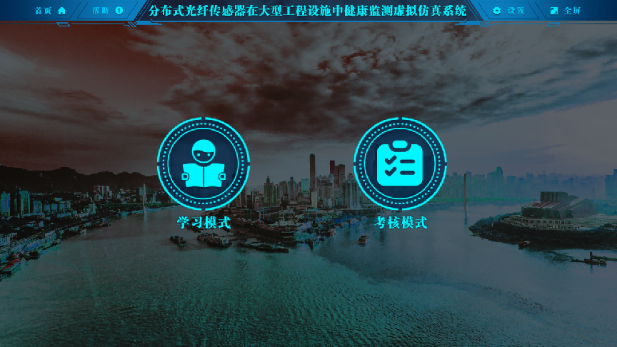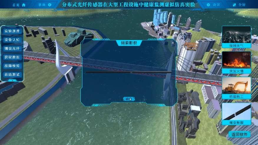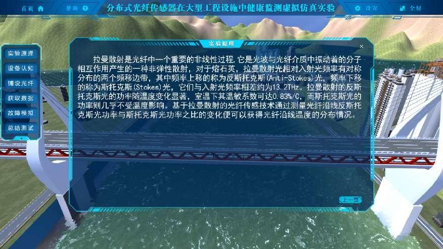 实验功能:实验选用重庆市核心区域——渝中半岛作为实验的整体场景,主体受监测建筑物为千厮门嘉陵江大桥,学生可在三维场景中自由漫游,同时学习实验背景、实验原理以及实验技术等内容,通过三维旋转认知实验各主要实验设备结构,学习设备参数及使用方式,包含分布式光纤传感监测仪、光纤、连接设备以及显示设备等,让学生亲历大型工程监测实践过程,实现“以虚代实”,将先进实验技术及时引入本科生实验教学,提高将专业理论知识应用于实践的能力。实验以光纤传感领域头部厂商的光纤传感监测设备作为模型构建基础,利用实际监测的数据作为依托,将真实的、准确的数据模型嵌入到虚拟仿真实验内,还原了现场勘查过程、光纤铺设过程、传感测试过程、数据采集过程、故障演练过程以及完整的数据分析过程,提供了随时、随地进行专业实践的机会,同时学生也体会如何根据实验内容和理论知识进行科学研究的方法。