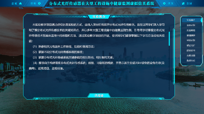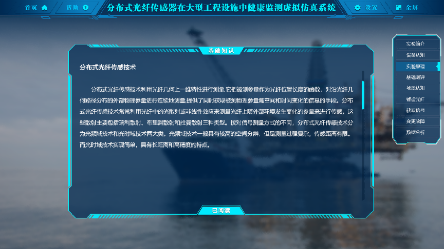 点击知识学习按钮对系统涉及的原理知识进行学习,通过原理知识的学习,掌握需要设计的分布式光纤传感器相关系统结构,进而通过设计实验实现系统相应的实验功能,用户可通过“已阅读”按钮切换不同的学习内容。