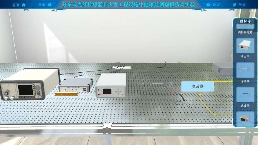 学习完传感技术手段等知识后,来到虚拟实验室完成基础设备搭建环节,在右侧器材库长按选中设备,需要搭建的设备为激光器、调制器、调制器电源、放大器、环形器、滤波器以及光谱仪等。